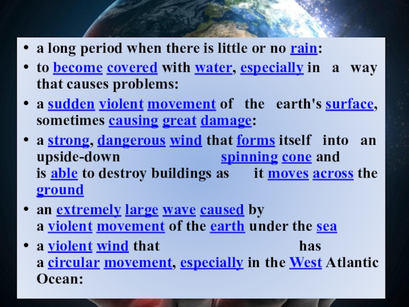 a long period when there is little or no rain:to become covered with water, especially in a way that causes problems:a sudden violent movement of the earth's surface, sometimes causing great damage:a strong, dangerous wind that forms itself into an upside-down spinning cone and