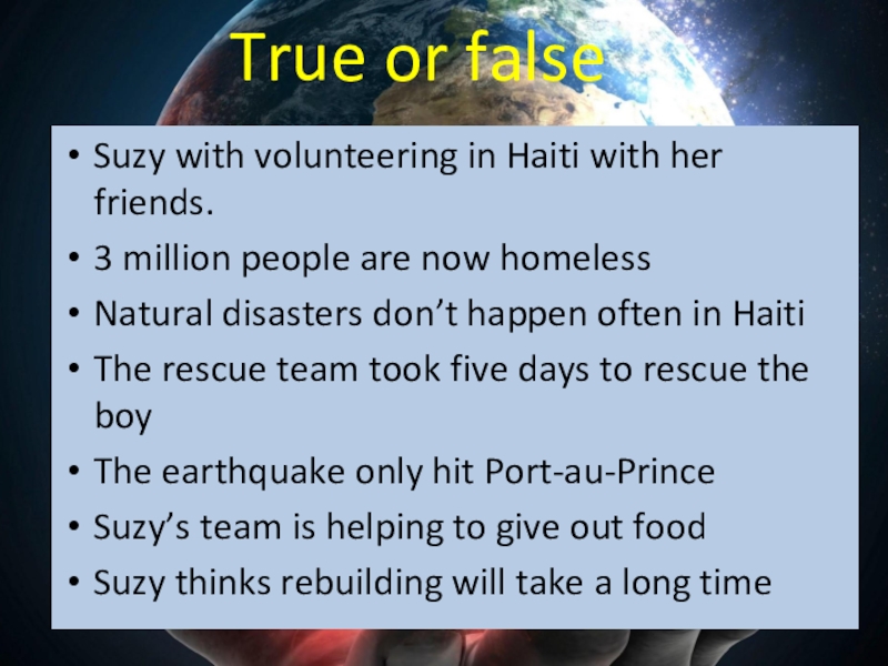 True or falseSuzy with volunteering in Haiti with her friends.3 million people are now homelessNatural disasters don’t