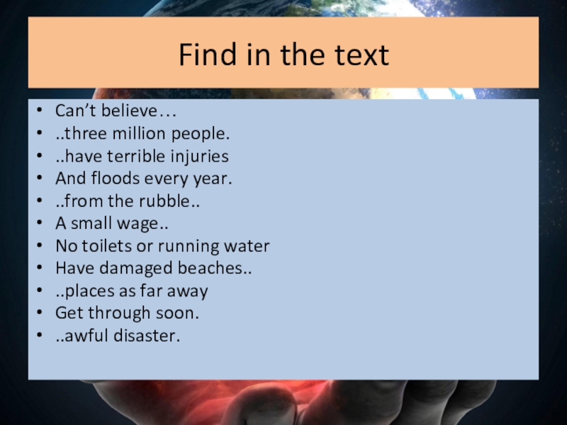 Find in the textCan’t believe…..three million people...have terrible injuriesAnd floods every year...from the rubble..A small wage..No toilets