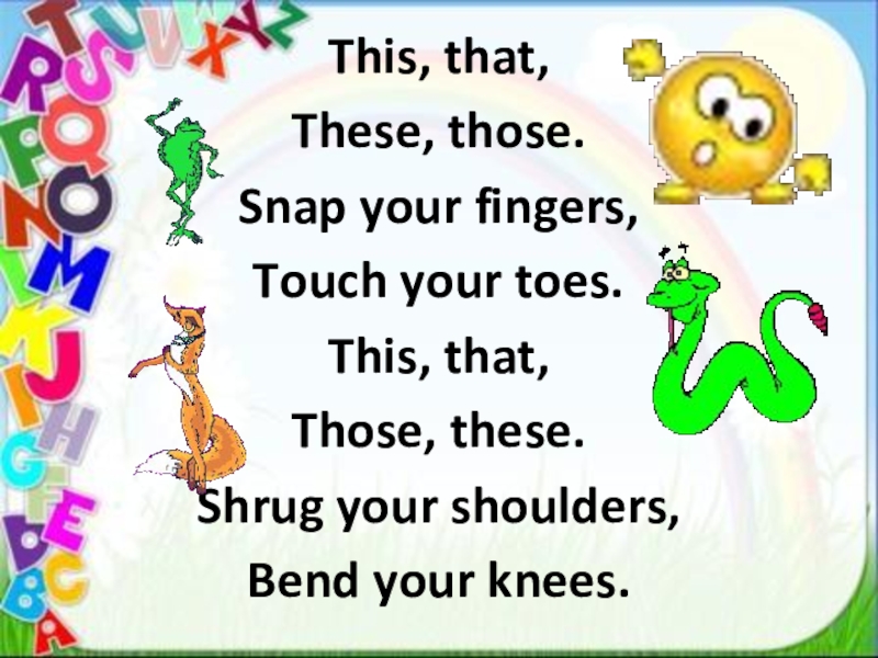This, that,These, those.Snap your fingers,Touch your toes.This, that,Those, these.Shrug your shoulders,Bend your knees.
