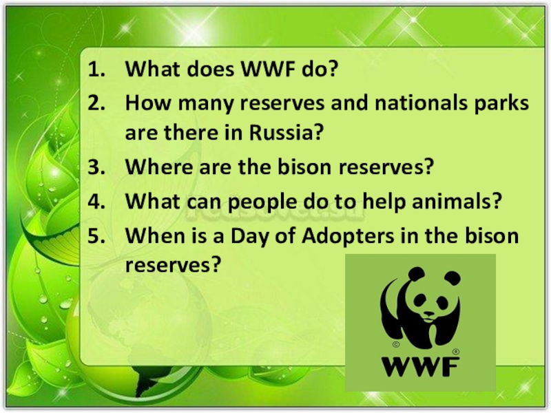 What does WWF do?How many reserves and nationals parks are there in Russia?Where are the bison reserves?What