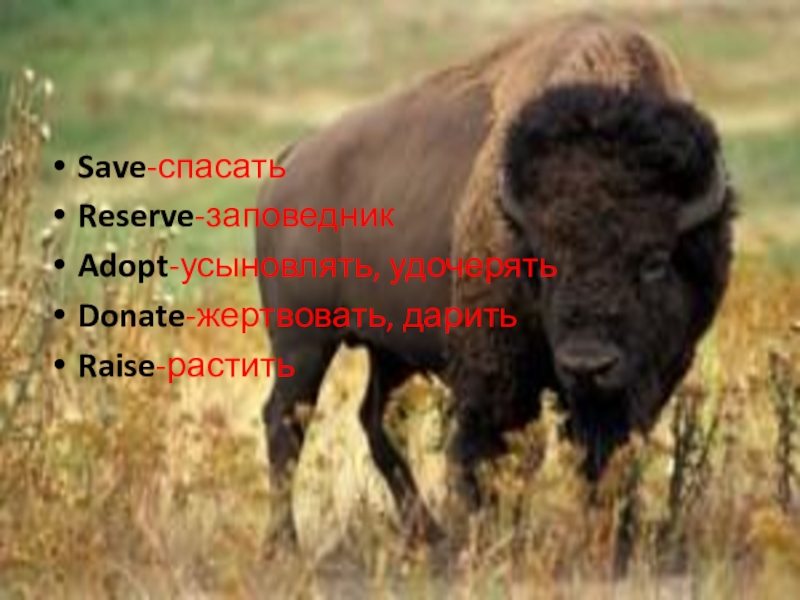 Save-спасатьReserve-заповедникAdopt-усыновлять, удочерятьDonate-жертвовать, даритьRaise-растить
