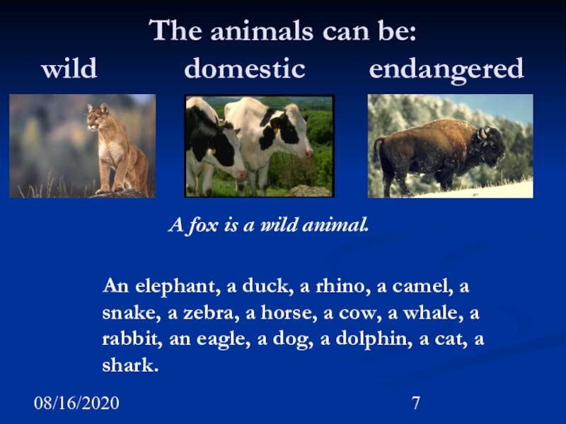 An elephant, a duck, a rhino, a camel, a snake, a zebra, a horse, a cow, a whale, a rabbit, an eagle, a dog, a dolphin, a cat, a shark.