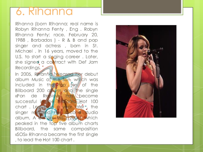 , Eng . Robyn Rihanna Fenty; race. February 20, 1988 , Barbados ) - R & B and pop singer and actress , born in St. Michael . In 16 years, moved to the U.S. to start a singing career . Later, she signed a contract with Def Jam Recordings.