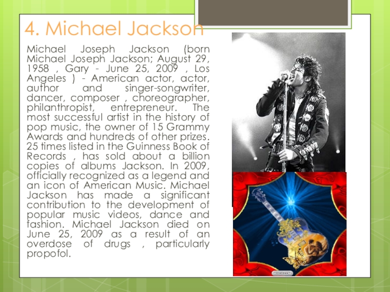 29, 1958 , Gary - June 25, 2009 , Los Angeles ) - American actor, actor, author and singer-songwriter, dancer, composer , choreographer, philanthropist, entrepreneur. The most successful artist in the history of pop music, the owner of 15 Grammy Awards and hundreds of other prizes. 25 times listed in the Guinness Book of Records , has sold about a billion copies of albums Jackson. In 2009, officially recognized as a legend and an icon of American Music. Michael Jackson has made a significant contribution to the development of popular music videos, dance and fashion. Michael Jackson died on June 25, 2009 as a result of an overdose of drugs , particularly propofol.