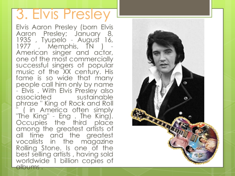 8, 1935 , Tyupelo - August 16, 1977 , Memphis, TN ) - American singer and actor, one of the most commercially successful singers of popular music of the XX century. His fame is so wide that many people call him only by name - Elvis . With Elvis Presley also associated sustainable phrase " King of Rock and Roll " ( in America often simply "The King" - Eng . The King). Occupies the third place among the greatest artists of all time and the greatest vocalists in the magazine Rolling Stone. Is one of the best selling artists , having sold worldwide 1 billion copies of albums .