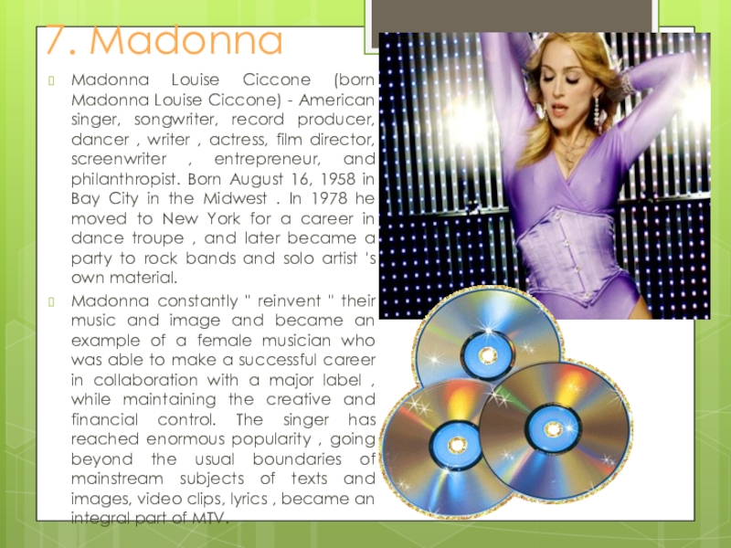 Madonna constantly " reinvent " their music and image and became an example of a female musician who was able to make a successful career in collaboration with a major label , while maintaining the creative and financial control. The singer has reached enormous popularity , going beyond the usual boundaries of mainstream subjects of texts and images, video clips, lyrics , became an integral part of MTV.