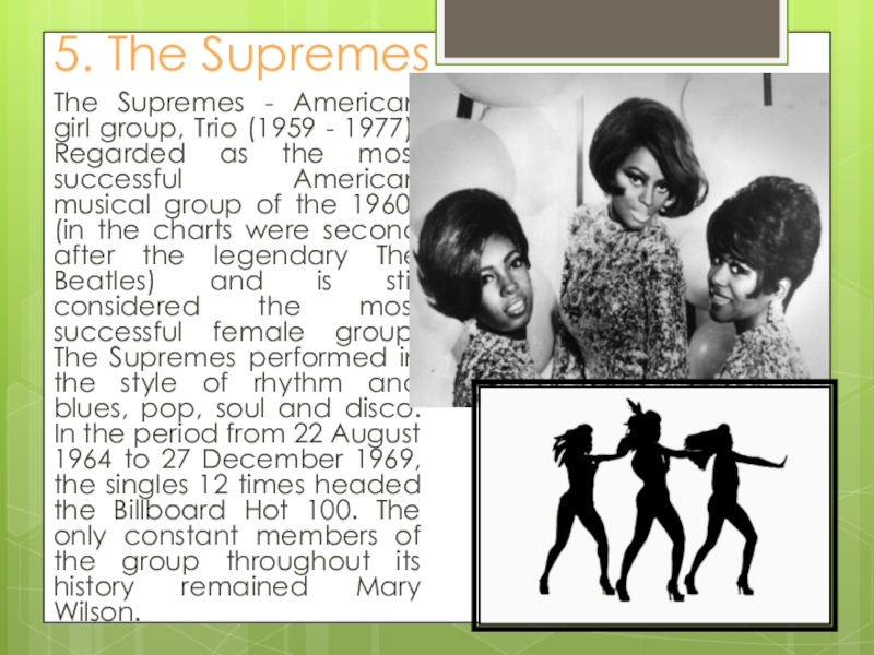 1977). Regarded as the most successful American musical group of the 1960s (in the charts were second after the legendary The Beatles) and is still considered the most successful female group. The Supremes performed in the style of rhythm and blues, pop, soul and disco. In the period from 22 August 1964 to 27 December 1969, the singles 12 times headed the Billboard Hot 100. The only constant members of the group throughout its history remained Mary Wilson.