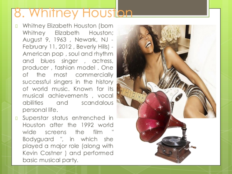 9, 1963 , Newark, NJ - February 11, 2012 , Beverly Hills) - American pop , soul and rhythm and blues singer , actress, producer , fashion model . One of the most commercially successful singers in the history of world music. Known for its musical achievements , vocal abilities and scandalous personal life.