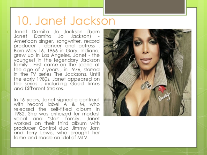 - American singer, songwriter, record producer , dancer and actress . Born May 16, 1966 in Gary, Indiana, grew up in Los Angeles. Janet - the youngest in the legendary Jackson family . First came on the scene at the age of 7 years , in 1976, starred in the TV series The Jacksons. Until the early 1980s, Janet appeared on the series , including Good Times and Diff'erent Strokes.