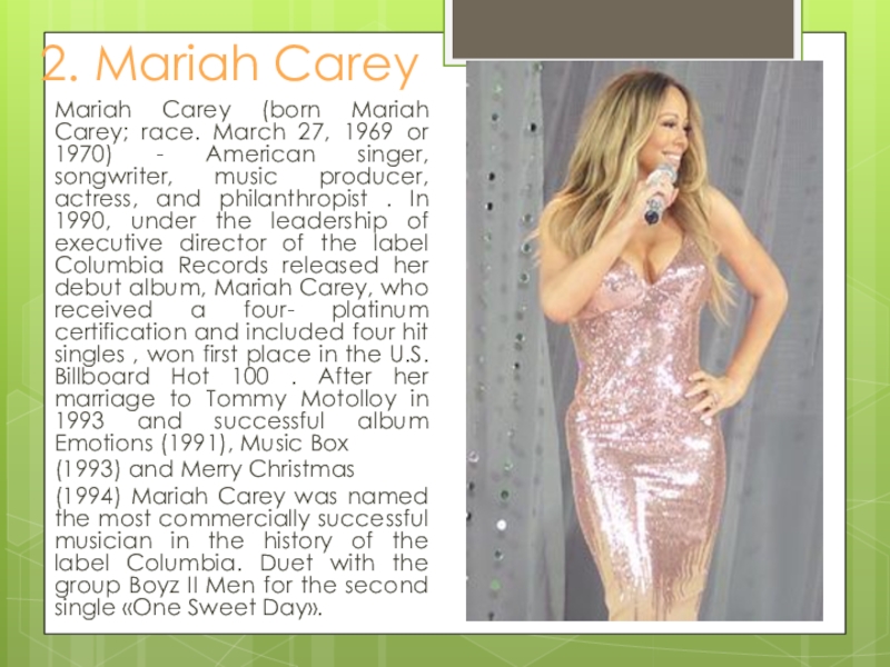 1969 or 1970) - American singer, songwriter, music producer, actress, and philanthropist . In 1990, under the leadership of executive director of the label Columbia Records released her debut album, Mariah Carey, who received a four- platinum certification and included four hit singles , won first place in the U.S. Billboard Hot 100 . After her marriage to Tommy Motolloy in 1993 and successful album Emotions (1991), Music Box