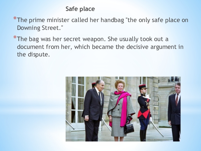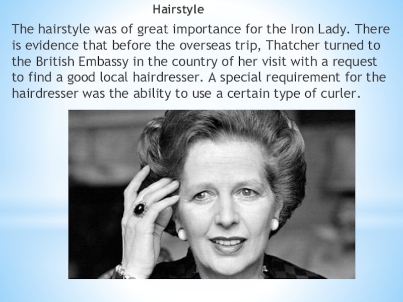 The hairstyle was of great importance for the Iron Lady. There is evidence that before the overseas trip, Thatcher turned to the British Embassy in the country of her visit with a request to find a good local hairdresser. A special requirement for the hairdresser was the ability to use a certain type of curler.