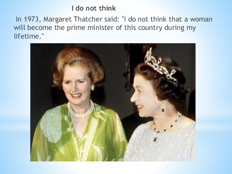 In 1973, Margaret Thatcher said: "I do not think that a woman will become the prime minister of this country during my lifetime."