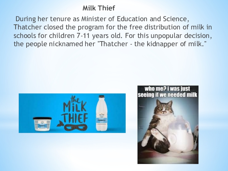 During her tenure as Minister of Education and Science, Thatcher closed the program for the free distribution of milk in schools for children 7-11 years old. For this unpopular decision, the people nicknamed her "Thatcher - the kidnapper of milk."