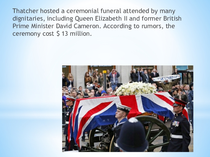 Слайд 12Thatcher hosted a ceremonial funeral attended by many dignitaries, including Queen