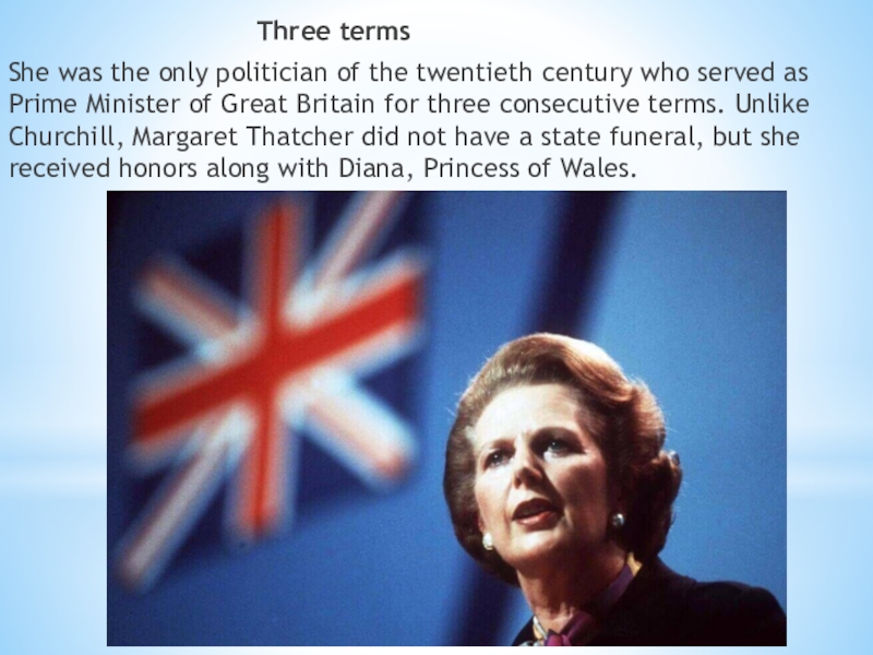 She was the only politician of the twentieth century who served as Prime Minister of Great Britain for three consecutive terms. Unlike Churchill, Margaret Thatcher did not have a state funeral, but she received honors along with Diana, Princess of Wales.