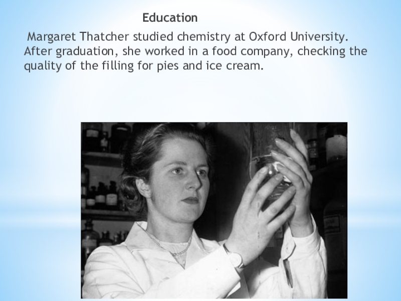 Margaret Thatcher studied chemistry at Oxford University. After graduation, she worked in a food company, checking the quality of the filling for pies and ice cream.