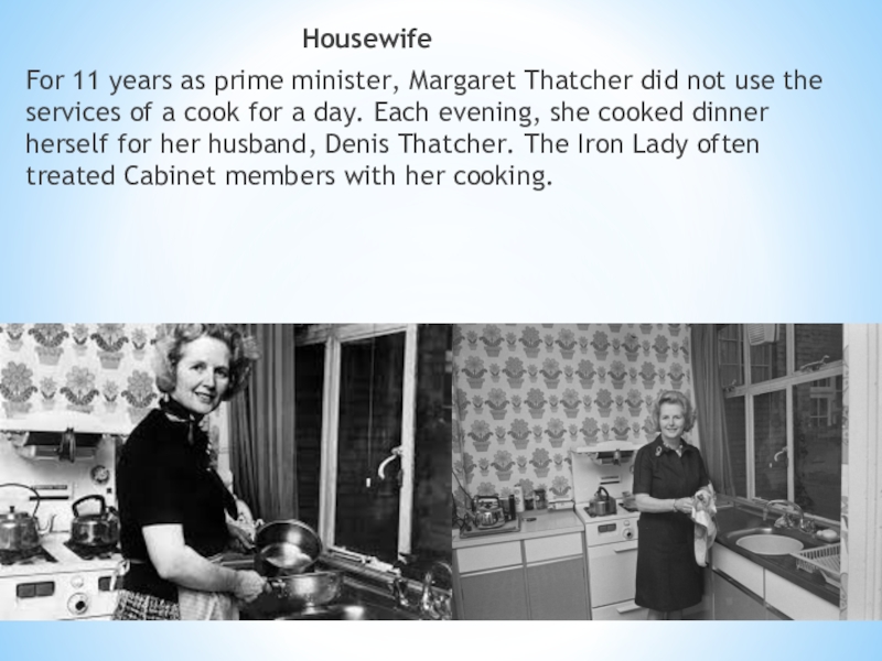 For 11 years as prime minister, Margaret Thatcher did not use the services of a cook for a day. Each evening, she cooked dinner herself for her husband, Denis Thatcher. The Iron Lady often treated Cabinet members with her cooking.