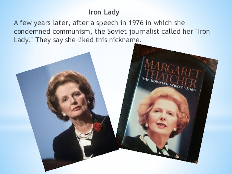 A few years later, after a speech in 1976 in which she condemned communism, the Soviet journalist called her "Iron Lady." They say she liked this nickname.