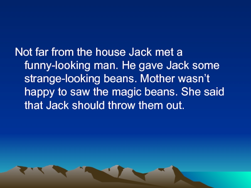 Not far from the house Jack met a funny-looking man. He gave Jack some strange-looking beans. Mother