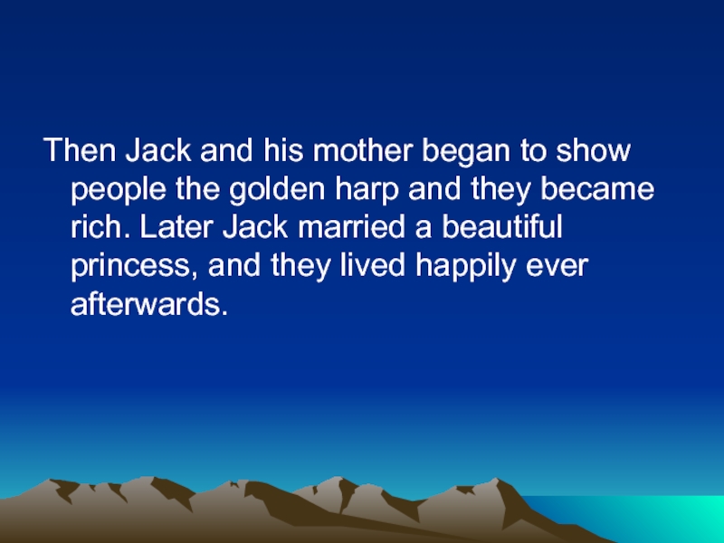 Then Jack and his mother began to show people the golden harp and they became rich. Later