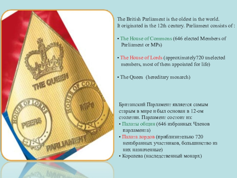 Вторая Палата - Палата общин, составляющая 651 Члена парламента, которые сидят в палате общин и являются избранными представителями британского народа. Каждый член парламента представляет один округ из 651 избирательного округа, на которые разделена Великобритания. У Палаты общин есть максимальный срок правления - пять лет, в конце которого проводятся всеобщие выборы. Однако, всеобщие выборы можно созвать в правительстве в любое время. Члены парламента сидят на параллельных рядах, известных как скамьи, с теми, кто поддерживает правительство - на одной стороне и оппозицию - на другой. Важные люди - переднескамеечники, менее важные - заднескамеечники. Палата общин выполняет функции определения и передачи законов и постановлений,исследовать действия правительства.