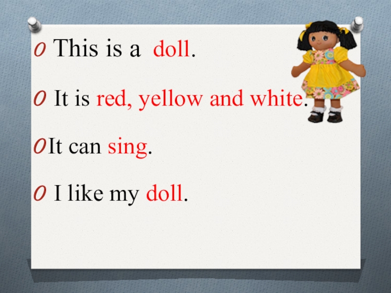 This is a doll. It is red, yellow and white.It can sing. I like my doll.