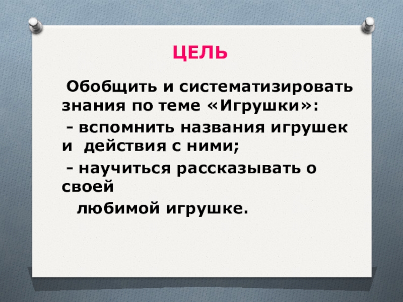 Слайд 2 Обобщить и систематизировать знания по теме «Игрушки»: