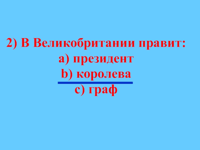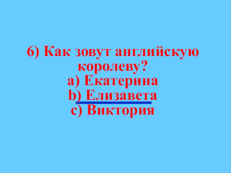 6) Как зовут английскую королеву?а) Екатерина b) Елизаветас) Виктория