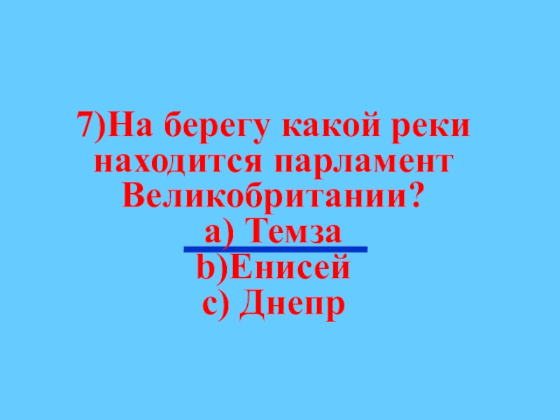 7)На берегу какой реки находится парламент Великобритании?a) Темзаb)Енисейc) Днепр