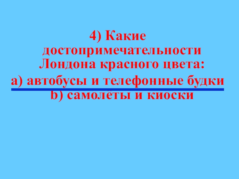 4) Какие достопримечательности Лондона красного цвета:а) автобусы и телефонные будки b) самолёты и киоски