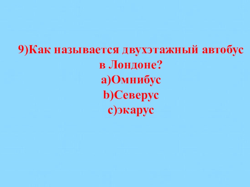 9)Как называется двухэтажный автобус в Лондоне?a)Омнибусb)Северусc)экарус