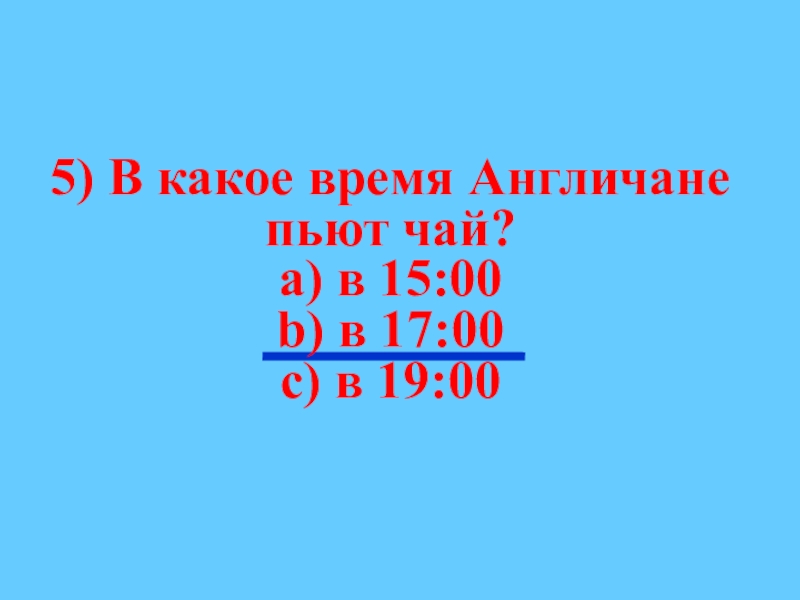 5) В какое время Англичане пьют чай?а) в 15:00 b) в 17:00 с) в 19:00