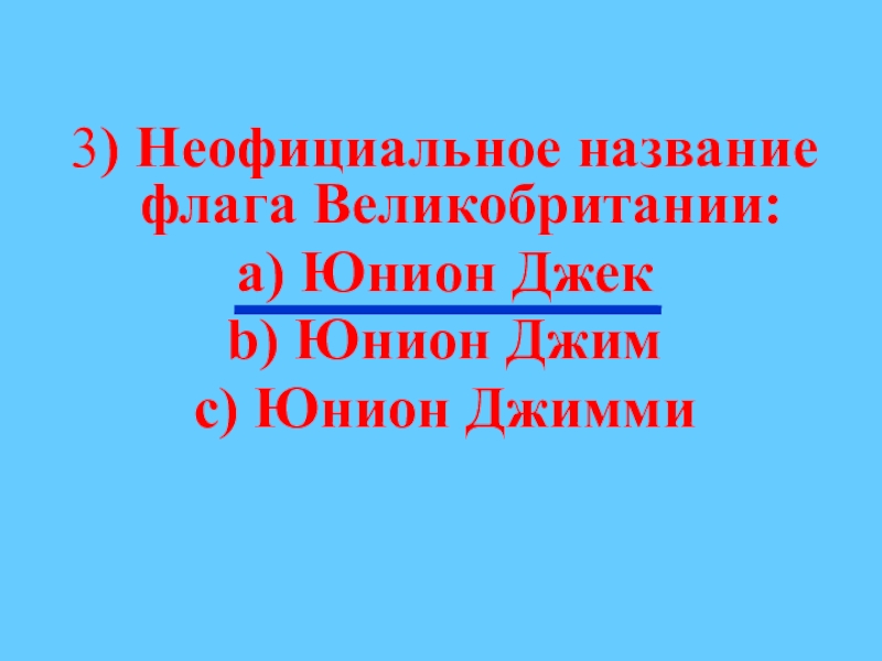 3) Неофициальное название флага Великобритании:а) Юнион Джек b) Юнион Джим с) Юнион Джимми