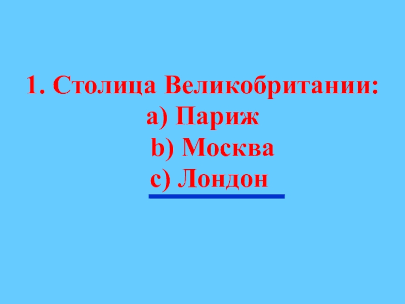 1. Столица Великобритании:а) Париж  b) Москва  с) Лондон