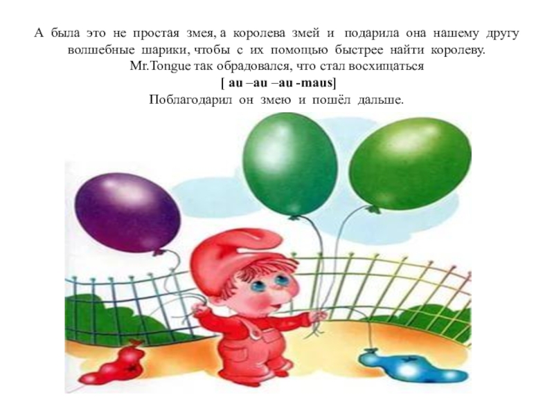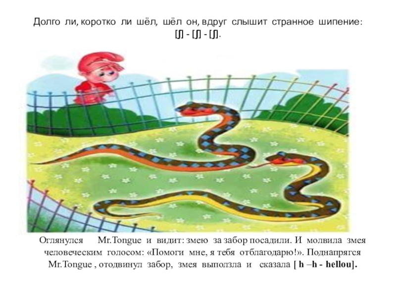 Оглянулся Mr.Tongue и видит: змею за забор посадили. И молвила змея человеческим голосом: «Помоги мне, я тебя отблагодарю!». Поднапрягся Mr.Tongue , отодвинул забор, змея выползла и сказала [ h –h - hellou].