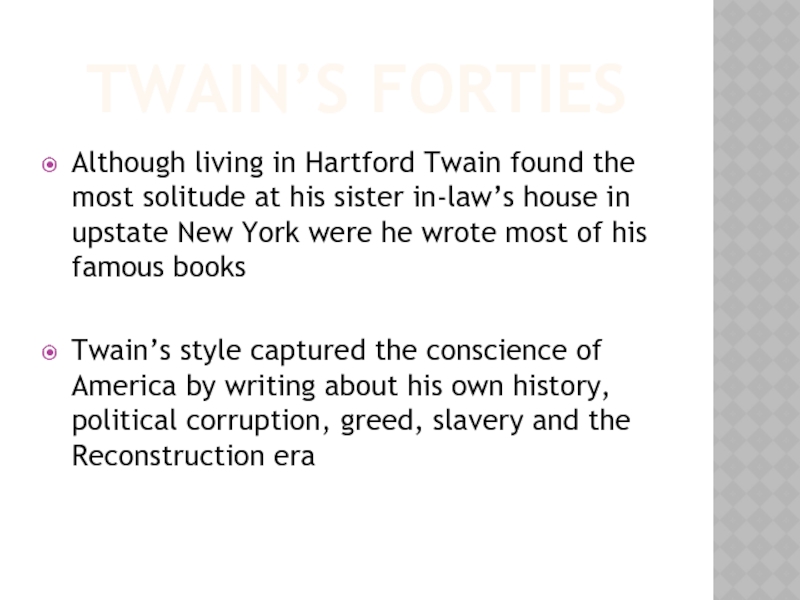 Twain’s style captured the conscience of America by writing about his own history, political corruption, greed, slavery and the Reconstruction era