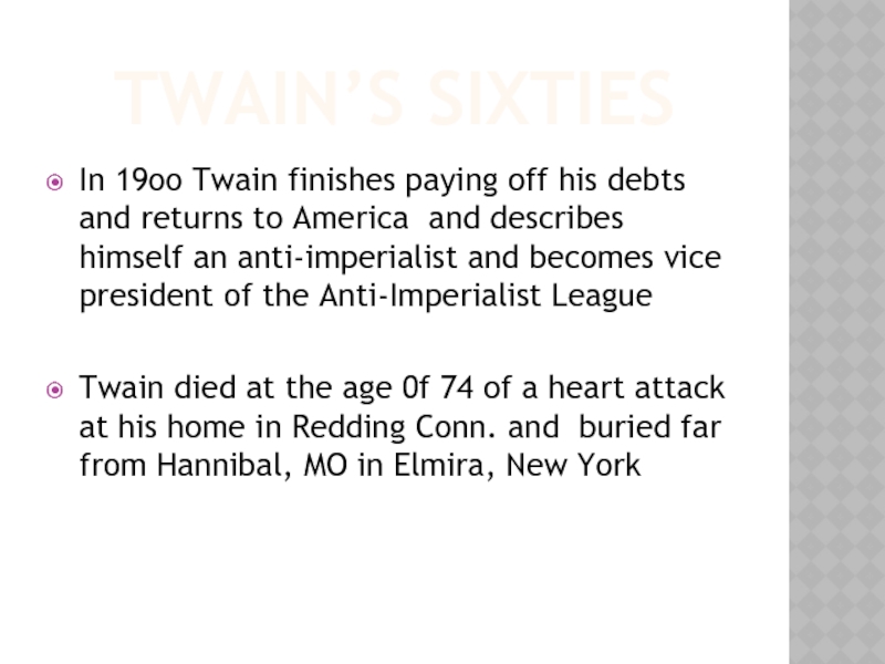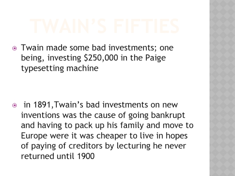 in 1891,Twain’s bad investments on new inventions was the cause of going bankrupt and having to pack up his family and move to Europe were it was cheaper to live in hopes of paying of creditors by lecturing he never returned until 1900