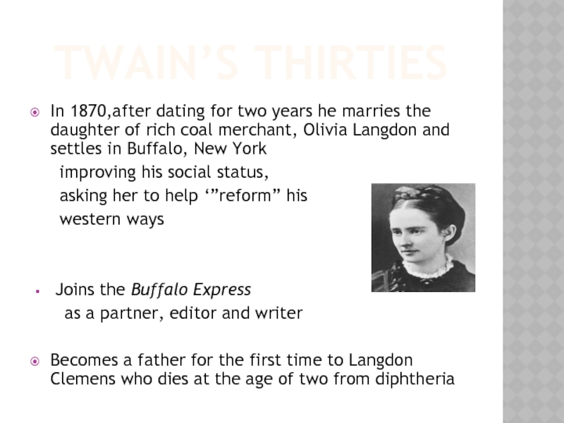 of rich coal merchant, Olivia Langdon and settles in Buffalo, New York