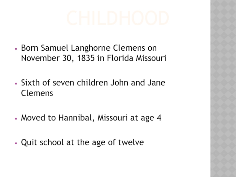 Born Samuel Langhorne Clemens on November 30, 1835 in Florida Missouri