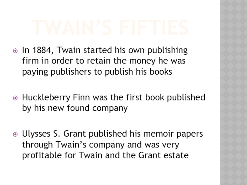 Ulysses S. Grant published his memoir papers through Twain’s company and was very profitable for Twain and the Grant estate