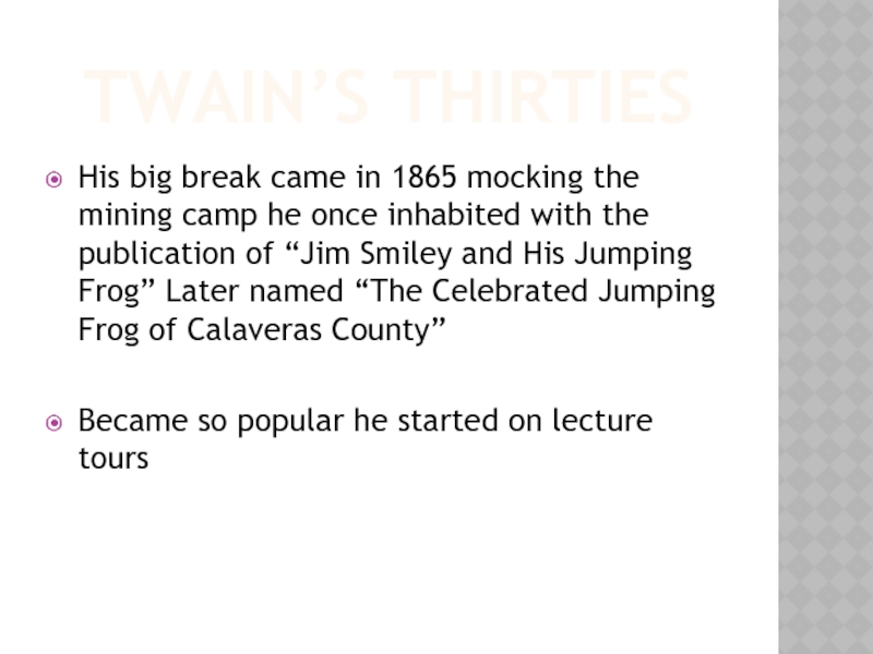 he once inhabited with the publication of “Jim Smiley and His Jumping Frog” Later named “The Celebrated Jumping Frog of Calaveras County”