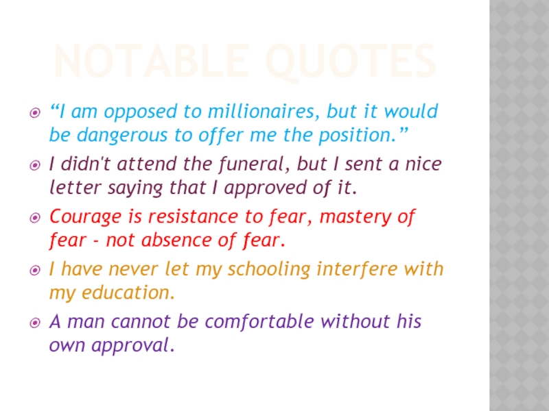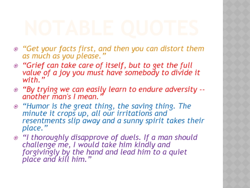 “I thoroughly disapprove of duels. If a man should challenge me, I would take him kindly and forgivingly by the hand and lead him to a quiet place and kill him.”