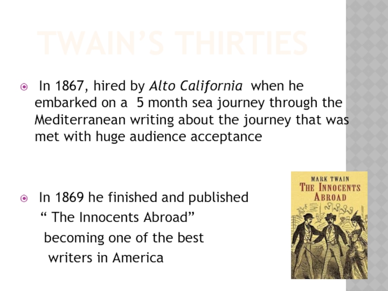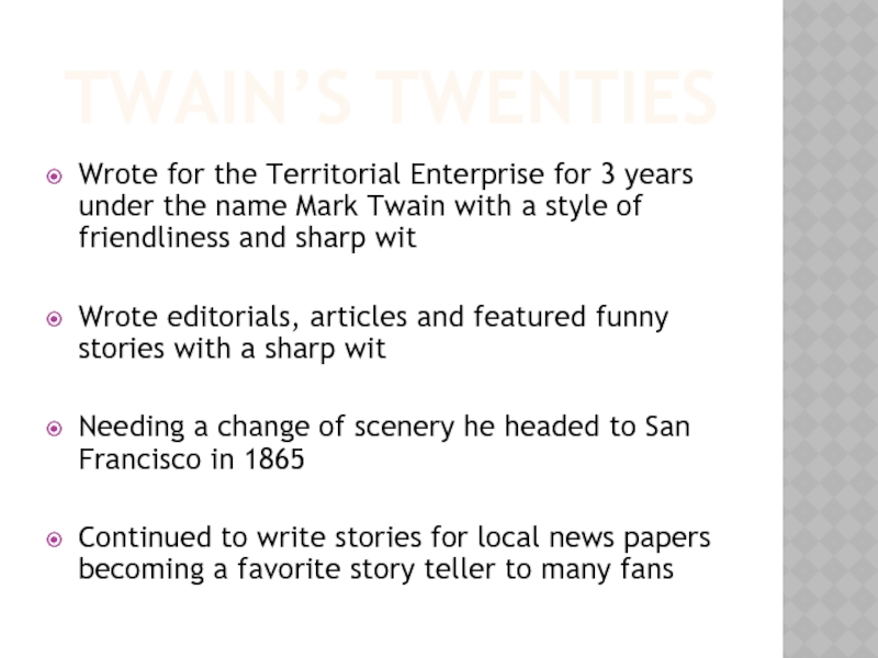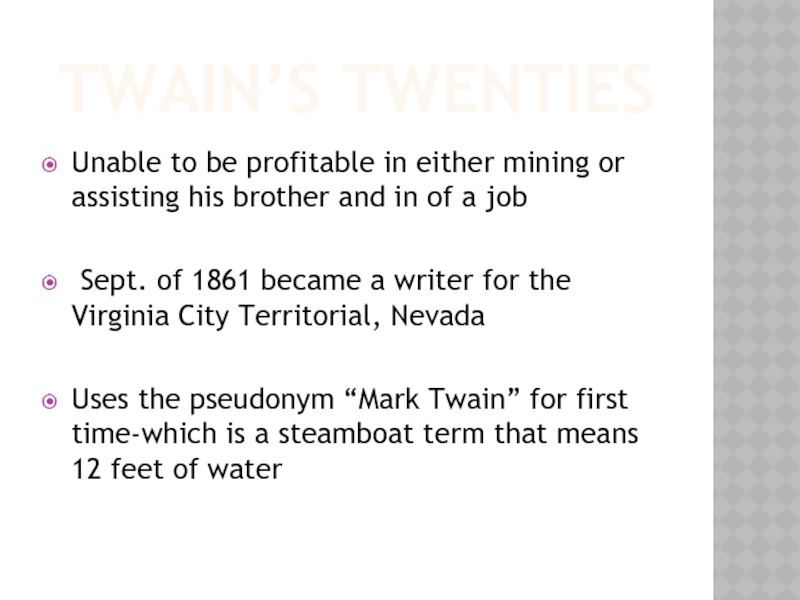 Uses the pseudonym “Mark Twain” for first time-which is a steamboat term that means 12 feet of water