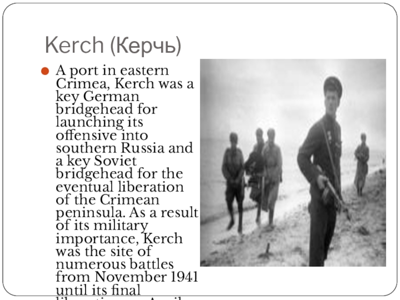 bridgehead for launching its offensive into southern Russia and a key Soviet bridgehead for the eventual liberation of the Crimean peninsula. As a result of its military importance, Kerch was the site of numerous battles from November 1941 until its final liberation on April 11, 1944.