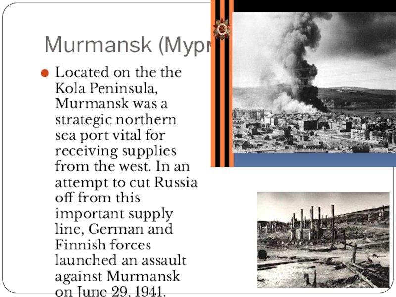 northern sea port vital for receiving supplies from the west. In an attempt to cut Russia off from this important supply line, German and Finnish forces launched an assault against Murmansk on June 29, 1941.
