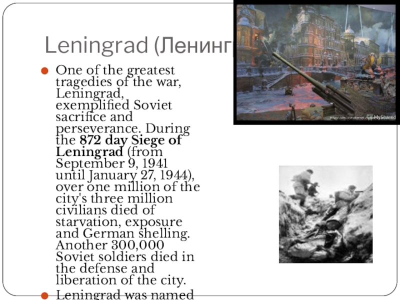 Soviet sacrifice and perseverance. During the 872 day Siege of Leningrad (from September 9, 1941 until January 27, 1944), over one million of the city's three million civilians died of starvation, exposure and German shelling. Another 300,000 Soviet soldiers died in the defense and liberation of the city.