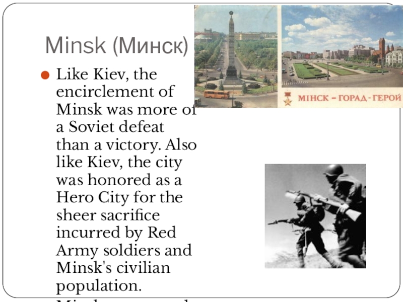 Soviet defeat than a victory. Also like Kiev, the city was honored as a Hero City for the sheer sacrifice incurred by Red Army soldiers and Minsk's civilian population.