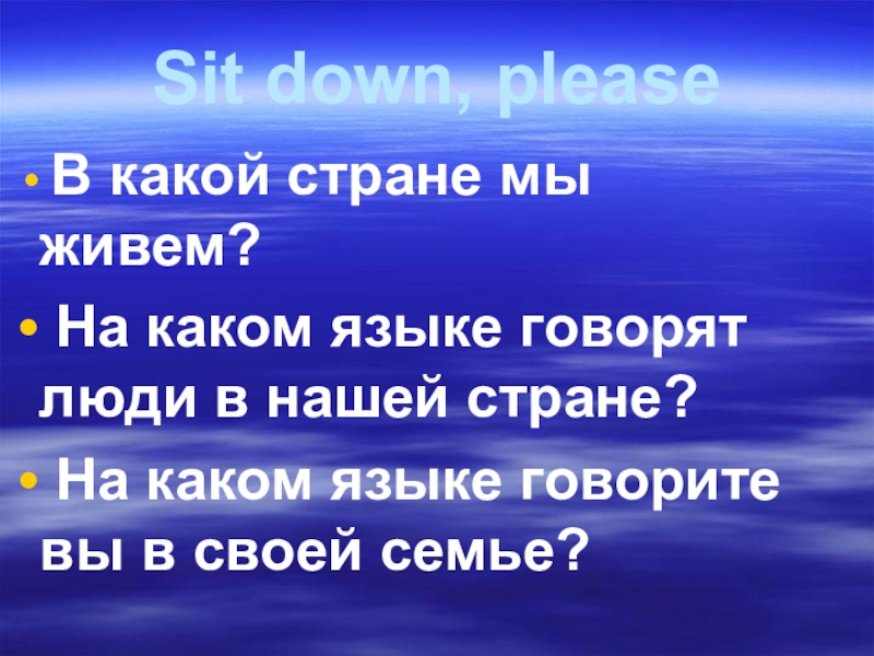 Sit down, please В какой стране мы живем? На каком языке говорят люди в нашей стране? На каком языке говорите вы в своей семье?