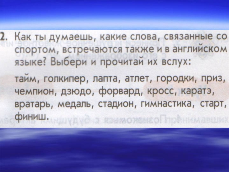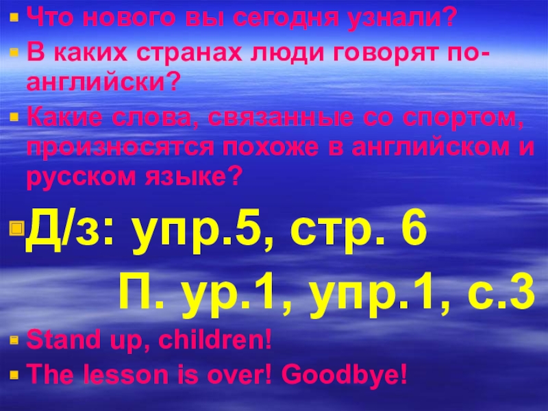 Что нового вы сегодня узнали?В каких странах люди говорят по-английски?Какие слова, связанные со спортом, произносятся похоже в
